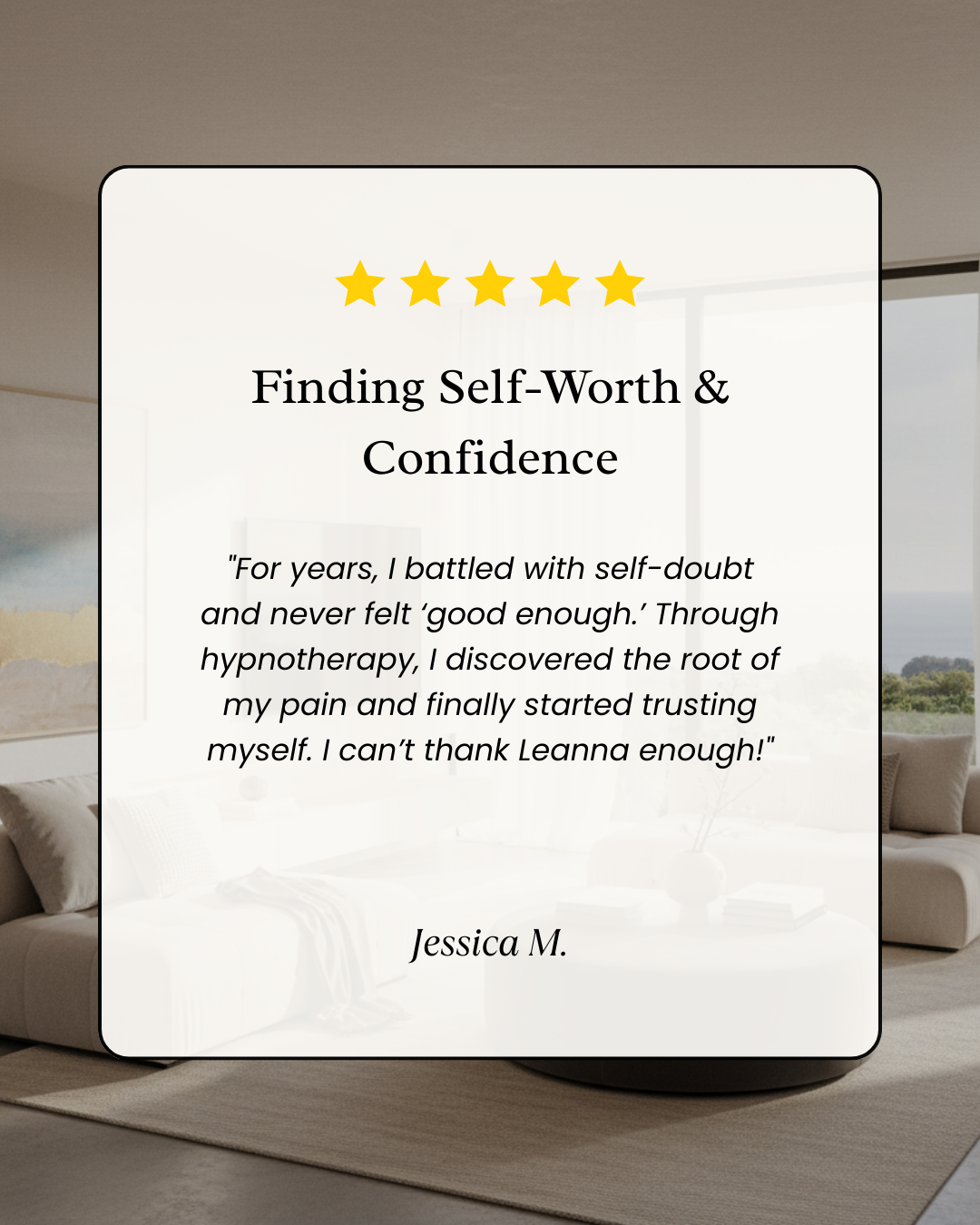 "For years, I battled with self-doubt and never felt ‘good enough.’ Through hypnotherapy, I discovered the root of my pain and finally started trusting myself. I can’t thank Leanna enough!"
