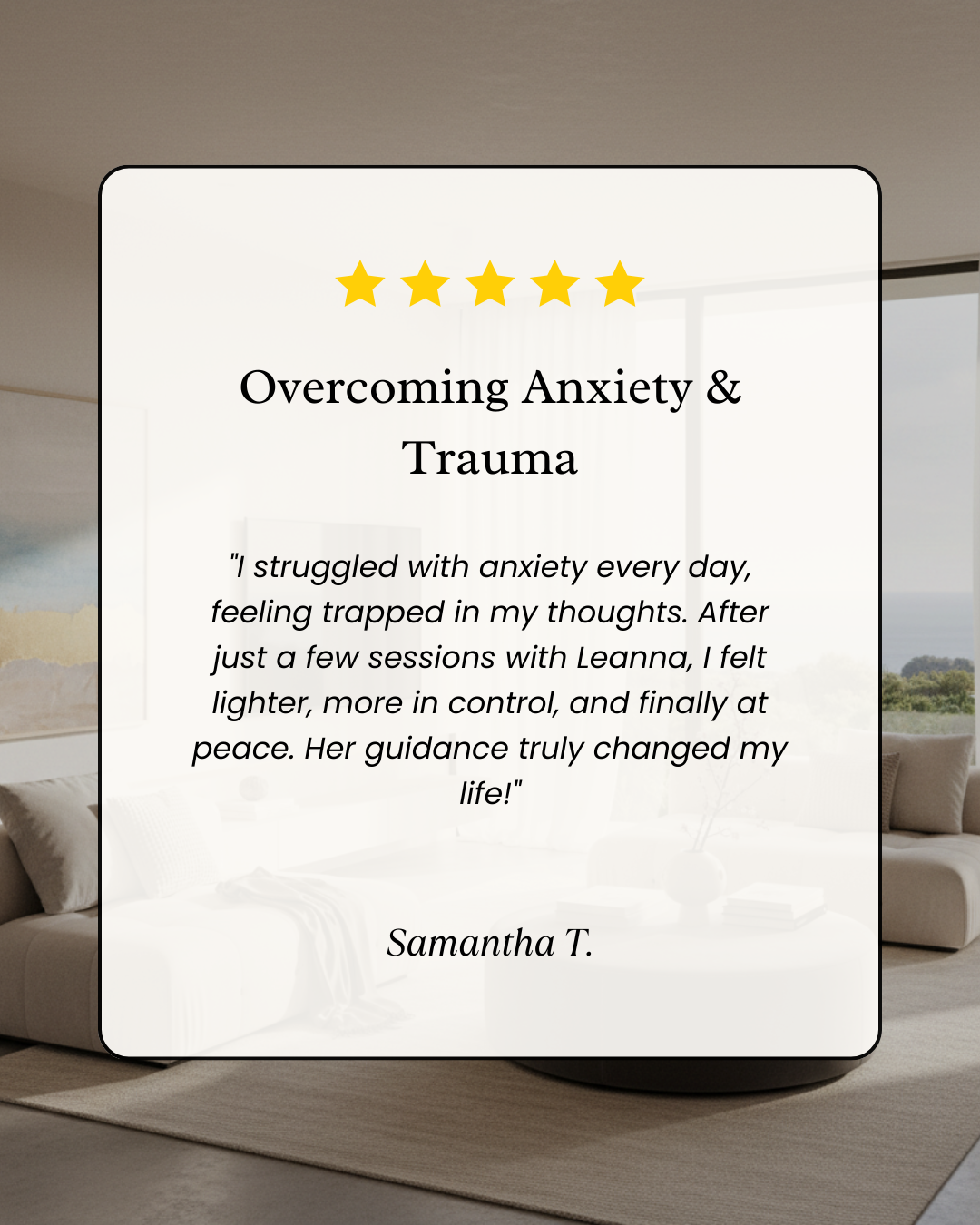 "I struggled with anxiety every day, feeling trapped in my thoughts. After just a few sessions with Leanna, I felt lighter, more in control, and finally at peace. Her guidance truly changed my life!"