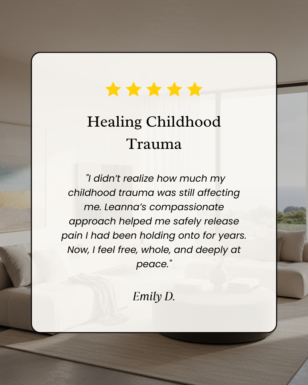 "I didn’t realize how much my childhood trauma was still affecting me. Leanna’s compassionate approach helped me safely release pain I had been holding onto for years. Now, I feel free, whole, and deeply at peace."