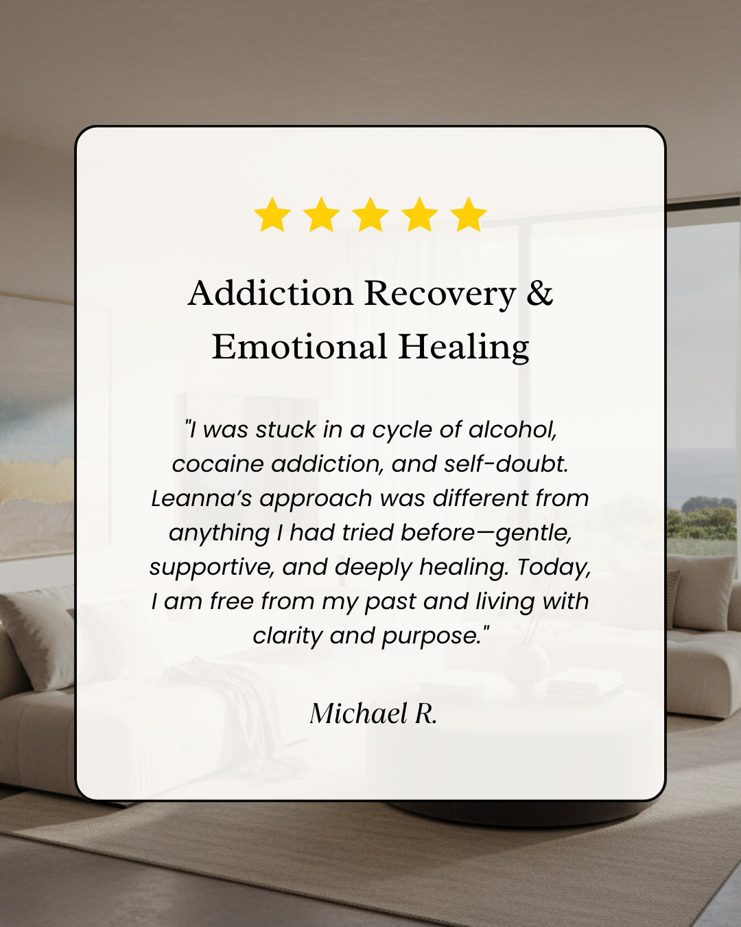 "I was stuck in a cycle of alcohol, cocaine addiction, and self-doubt. Leanna’s approach was different from anything I had tried before—gentle, supportive, and deeply healing. Today, I am free from my past and living with clarity and purpose."
